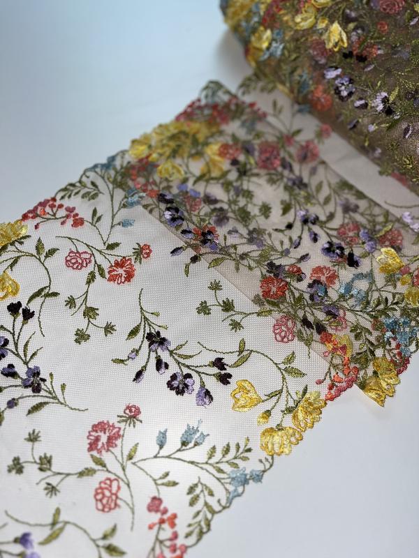 стабільна вишивка/мереживо для білизни чи декору Тілесний прозорий фон (не віддає жовтим чи бежевим) Є трохи блиску на фото зі спалахом, вживу не відблискує Є в наявності 28м (відрізки по 14 метрів) Ширина 22см