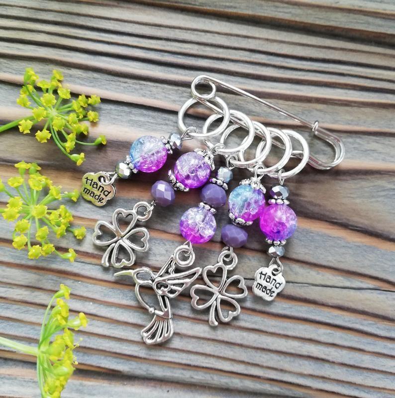 Маркеры для вязания ручной работы. Изготовлены из микса бусин и металлических подвесок. Подходят под размеры спиц от 2 до 7 мм. В комплекте 5 маркеров и удобная булавка для их хранения. Отличный и необычный вариант для подарка рукодельнице. Упаковка - подарочная коробочка.