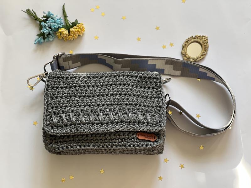 Вязаная крючком сумка, которая сочетает в себе утонченность ручной работы и современный стиль. Эта сумка станет вашим незаменимым аксессуаром, добавляя шарма любому образу. Особенности: Материал: высококачественный полиэфирный шнур серебристого цвета. Цвет: Серебристый, с серым текстильным ремешком. Дизайн: Оригинальный узор, ручная работа. Функциональность: Компактная, но вместительная, подойдет для ежедневного использования. Состояние: Новая, ручная работа. Детали: Вязаный клапан с магнитной застежкой. Съемный текстильный ремешок с геометрическим узором. Бирка "Handmade". Металлическая фурнитура серебряного цвета. Преимущества: Эксклюзивный дизайн, ручная работа. Высококачественные материалы. Универсальный аксессуар, который подойдет к любому образу.