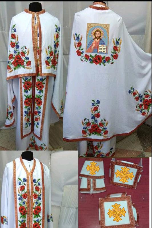 Заготовка для вишивки бісером або нитками. Тканина - габардин. Кольори тканини можна змінювати. Ціна вказана за весь комплект. До комплекту входить : фелон (викроєний), стихар, епітрахиль, наручні, пояс, таїнства.