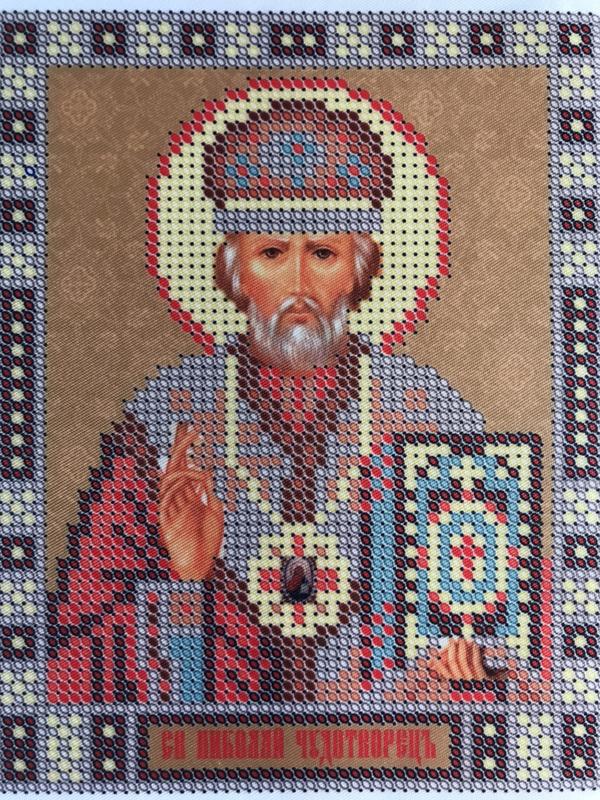 Ткань - атлас. Схема - цветная мозаика, состоящая из кружек (означает бисеринки определенного цвета) и точек (указывают, где должна входить игла во время пришивания бисеринки). Лик и руки не вышиваются. В качестве подкладки для уплотнения ткани использован флизелин. также можно заказать рамку для оформления работы