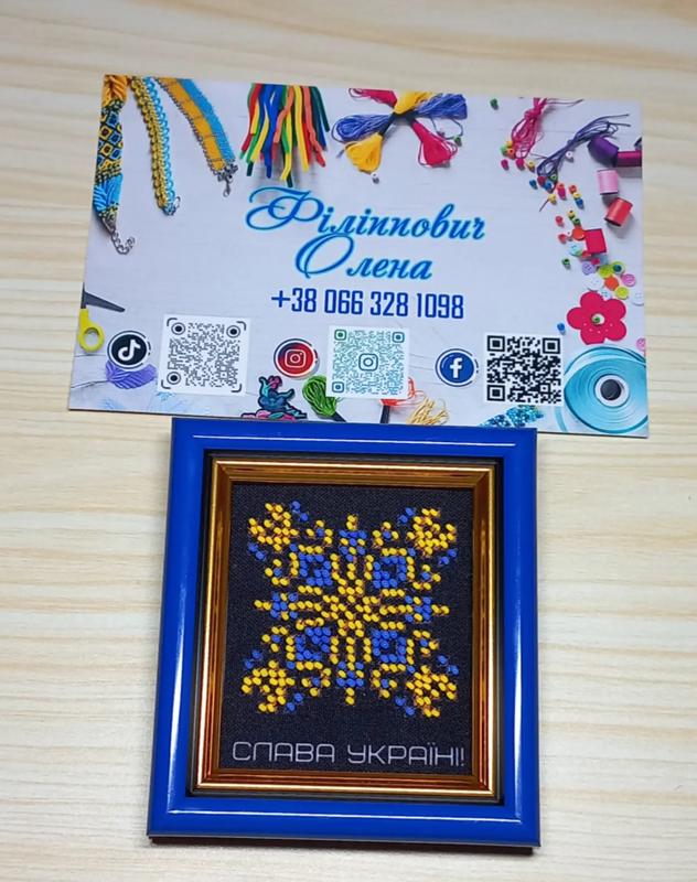 "СЛАВА УКРАИНЫ" закрытая вышивка-охран, QR-код в вышивке, вышивка чешским бисером. Варианты рамок желтый и синий, пластик, двойное двп, без стекла.