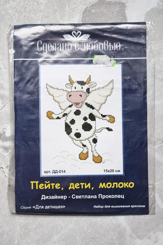 Набор для вышивки сделан с любовью рос фаворит.. Набор для вышивки детский. Коровка дд-2 - Пейте, дети молоко. Продажа старых запасов. Цена указана на 1 набор. Размер: 15 х 20 см В наборе: цветная схема, мулин, канва, игла.