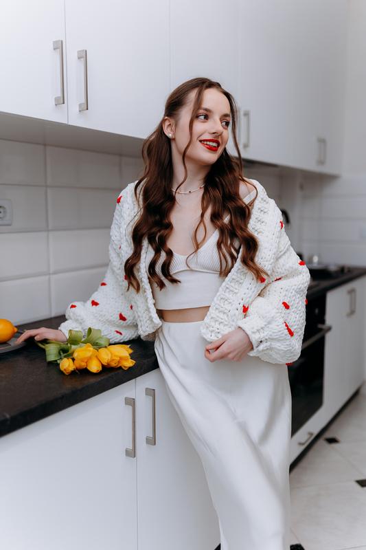 Короткий молочний кардиган з дрібними сердечками — ручна робота Цей ніжний короткий молочний кардиган з миленькими сердечками — ідеальний варіант для створення романтичного та затишного образу. Виготовлений вручну з гіпоалергенних ниток Alize Puffy, які дарують комфорт і не викликають алергічних реакцій. Матеріал: м’які, пружні нитки Alize Puffy, що не тільки чудово носяться, а й мають натуральні властивості. Дизайн: кардиган має ніжний візерунок з маленькими сердечками, що додає йому особливого шарму. Фасон: укорочений, універсальний для будь-якої пори року. Індивідуальне виготовлення на замовлення: - Колір: обирайте з нашої палітри. Ви можете змінювати колір кардигана відповідно до ваших уподобань. - Модель: кожен кардиган виготовляється під замовлення, тому ви можете вносити зміни у фасон: ▫️ додати/прибрати кишені ▫️ змінити довжину (короткий, середній, довгий) ▫️ додати або прибрати декоративні елементи (квіточки, серця) ▫️ змінити кількість чи тип ґудзиків (уточнюйте перед замовленням) 📅 Термін виготовлення: залежить від складності замовлення, тому його необхідно уточнювати перед оформленням. Кардиган як індивідуальний виріб виконуємо за умови авансу 50% від суми замовлення. 🔘 Палітра кольорів: додається до кожного товару 💬 Унікальність кожної роботи: цей кардиган створений саме для вас, з урахуванням ваших побажань. Ви отримуєте не просто річ, а справжній витвір мистецтва, який буде тільки у вас!