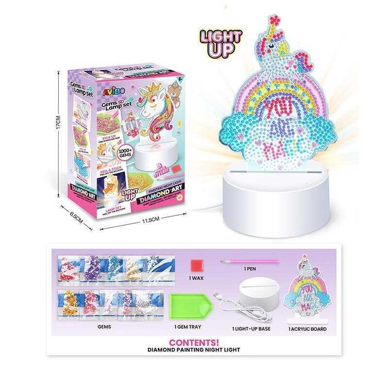 Творческий набор для декорирования и освещения Этот уникальный ночник A 5506 E сочетает процесс украшения и практичное освещение детской комнаты. Ребенок самостоятельно украшает акриловую фигурку разноцветными стразами, создавая объемную мозаику, которая затем устанавливается на световую основу. - Размеры изделия: 10х10х18 см - Работает от сети - Три режима света: теплый, холодный и нейтральный - Акриловый стенд с возможностью украшения алмазной мозаикой - В комплекте алмазы и инструменты для декорирования - Развивает внимание, усидчивость и мелкую моторику