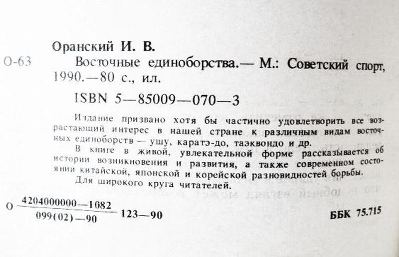 Восточные единоборства. Игорь Оранский Издательство «Советский спорт», Москва, 1990г. Формат 84х108/32, язык русский, 80 стр. с иллюстрациями, мягкая обложка. Одна из первых легально изданных в Советском Союзе книг, посвященная самым популярным на тот момент восточным единоборствам. Издание призвано удовлетворить все возрастающий интерес к различным видам восточных единоборств — ушу, каратэ-до, таэквондо и др. В книге в живой, увлекательной форме рассказывается об истории возникновения и развития, а также современном состоянии китайской, японской и корейской разновидностей борьбы.