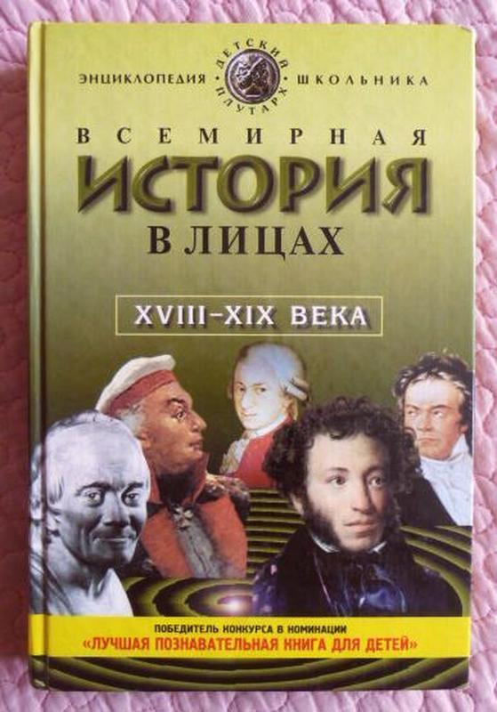 Всемирная история в лицах. XVIII-XIX век. Владимир Бутромеев Энциклопедия для школьника. Книга-победитель в номинации «Лучшая познавательная книга для детей» Из-во «Олма-Пресс», Москва, 2002г. Формат увеличен 60х90/16, язык русский, 336 стр. с множеством иллюстраций, переплёт твёрдый, состояние хорошее. Популярная энциклопедия для детей знакомит с великими и знаменитыми людьми нового времени, оставившими неизгладимый след в истории. Это великие ученые Ньютон и Лавуазье, просветители Вольтер, Дидро и Руссо, гениальные композиторы Гайдн, Моцарт и Бетховен, выдающиеся полководцы Румянцев, Суворов и Кутузов, поэты Державин и Пушкин, знаменитый баснописец Крылов. Энциклопедия адресована детям среднего и школьного возраста.