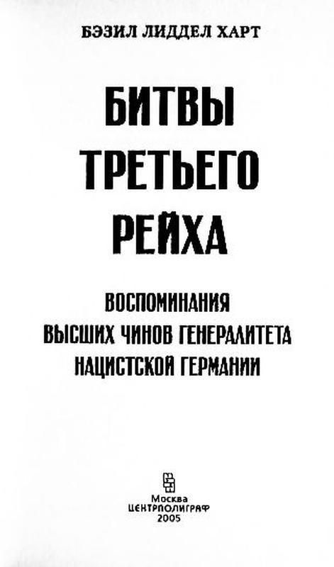 Битви третього рейху. Спогади вищих ремонтів генералітету німецької Німеччини. Бетзіл Ліддел Харт. Через «Центрполіграф», температура плечей, 2005 г. Формат 70х90/32, мова російська, 367 стор., палітурка тверда, стан чудовий. Ця книга була створена на основі оповідань німецьких генералів. Автор висуває думку німецьких стратегів про Червону армію й про армії союзників, наводить причини, які, на думку безпосередніх учасників подій, привели Німеччину до кроху. Книга написана яскравою і образною мовою. Автор зумів зробити серйозні проблеми військової історії, стратегії та тактики цікавими та зрозумілими читачеві. Сер Бессіл Генрі Ліддел Гарт (1895-1970) — до заснування в лицарі відомий як капітан Б. Г. Ліддел Гарт — англійський військовий історик і органік, який зробив великий вплив на розвиток механізованої війни у XX столітті, а також на теорію стратегії загалом. Ліддел — це дівоче прізвище його матері, він почав використовувати її як частину свого прізвища з 1921 року. Служив офіцером у британській армії під час першої світової війни, був свідком позиційної війни. Трапляв битву на Соммі, був відзначений за хоробрість. У наступні кілька років він замислювався про причини таких високих людських втрат і розробляв принципи, що лежать в основі гарної стратегії, принципи, які, за його словами,хітувалися всімакодніми першої світової війни.