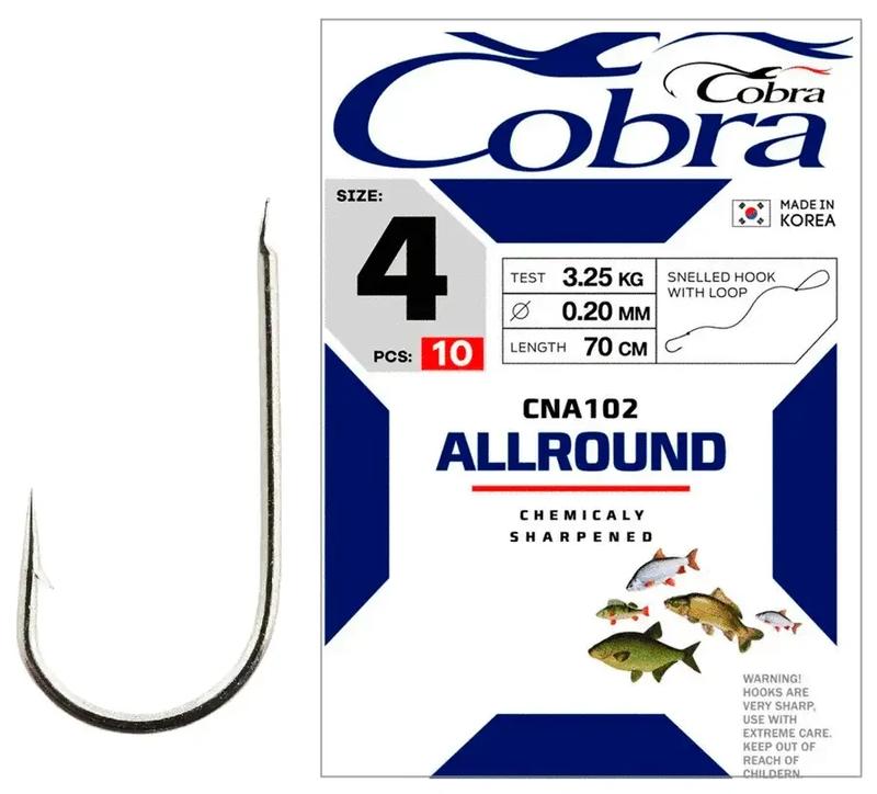 Крючок с поводком Cobra – это широкая линейка готовых изделий, в которой можно подобрать необходимый вариант для ловли рыбы в различных условиях. Они подойдут для использования, как в фидерной, так и поплавочной ловле. Каждый крючок оснащен леской, подобранной по диаметру, длина которой 70 см, что дает возможность при необходимости укорачивать поводок. Крючки в оснастке используются из углеродистой стали с химической заточкой жала. Острота и прочность крючка позволят без проблем бороться даже с трофейной рыбой. Готовый поводок Cobra отличный вариант для рыболовов, не любящих заниматься вязанием на берегу, а предпочитающих именно сам процесс ловли.