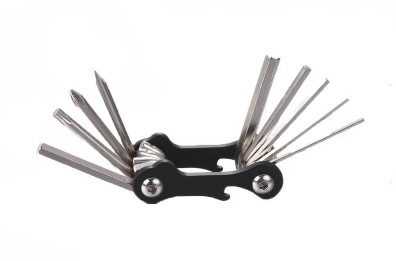 Мультитул KEN TECH KL-9834A черный+СР 10 функций - складной, портативный набор инструментов первой необходимости, для оперативного обслуживания велосипеда. Шестигранники: 2,5-3-4-5-6-8мм, Отвертки: плоская, крестовая, торкс T25, Открывашка для бутылок,