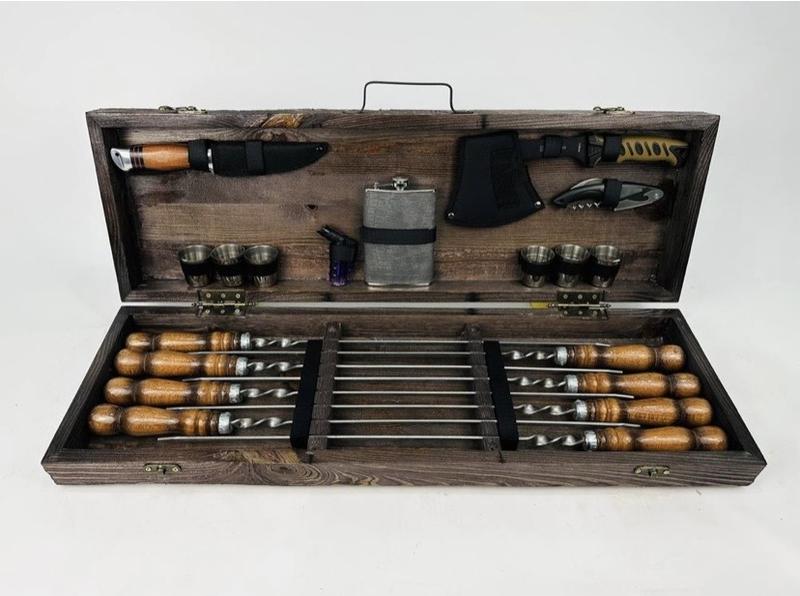 Оригинальный подарок для родного человека. НАБОРИ НА БУДЬ-ЯКИЙ БЮДЖЕТ. Индивидуальная гравировка на кейсе (любые надписи на ваш вкус, рисунки) Кейс из натурального дерева. Подарок на долгие годы. Комплектация: -8 шампуров серии "Кизляр" -охотничий нож -сокира -фляга -6 чарок -запальничка -штопор-открывалка.
