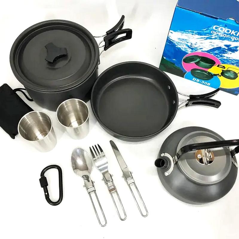 Походной набор посуды, Посуда кемпинговая, Посуда из нержавейки для туризма, NST Идеальное решение для любителей кемпинга, походов и активного отдыха на природе. Этот компактный и удобный набор включает все необходимое для приготовления пищи на открытом воздухе, обеспечивая комфорт и практичность в любых условиях. Изготовленный из высококачественных материалов, набор гарантирует долговечность и надежность. Основные преимущества: - Компактность и удобство: Все предметы набора легко складываются и упаковываются в чехол для транспортировки, что обеспечивает удобство в использовании и хранении. - Высокое качество материалов: Посуда изготовлена из алюминиевого сплава и нержавеющей стали, что обеспечивает долговечность и устойчивость к механическим повреждениям. - Универсальность: Набор включает все необходимые предметы для приготовления пищи и обслуживания во время путешествий. Особенности товара - Котелок со складными ручками и крышкой: Размеры - 170*90 мм, идеально подходит для приготовления супов и других блюд. - Сковородка со складной ручкой: Размеры - 180*45 мм, удобно использовать для жарки. - Чайник 800 мл: Размеры - 150*80 мм, идеально подходит для кипячения воды и приготовления напитков. - Стаканы из нержавеющей стали (№304): Объем каждого - 200 мл, размеры - 70*78 мм, в наборе 2 шт. - Складные столовые приборы: Включают вилку, ложку и нож, обеспечивая все необходимые инструменты для еды. - Карабин для удобной транспортировки: Облегчает переноску набора во время походов. - Чехол для транспортировки: Компактный и удобный для переноски и хранения всех предметов набора. Технические характеристики - Котелок: 170*90 мм - Сковородка: 180*45 мм - Чайник: 800 мл, 150*80 мм - Стаканы из нержавеющей стали: 70*78 мм, объем - 200 мл - Вес набора: Удобен для транспортировки и хранения