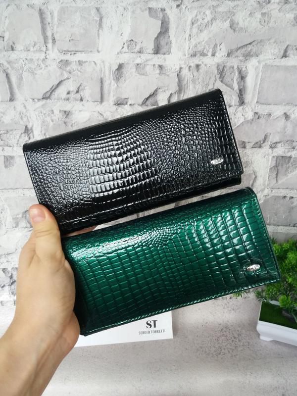 великий жіночий шкіряний гаманець Sergio Torretti. Зовнішня частина - лакова шкіра, внутрішня частина - натуральна м'яка шкіра. Основне відділення закривається на кнопку. Всередині є 3 відкриті відділення для банкнот, подвійна монетниця на защіпку, кишеня-перегородка на блискавці, один великий відкритий кишеню і 9 кишень для візитних карток, один із яких прозорий. Зовні гаманця на звороті є плаский відкритий кишеню. Розмір (див) 18,5*9,5*4