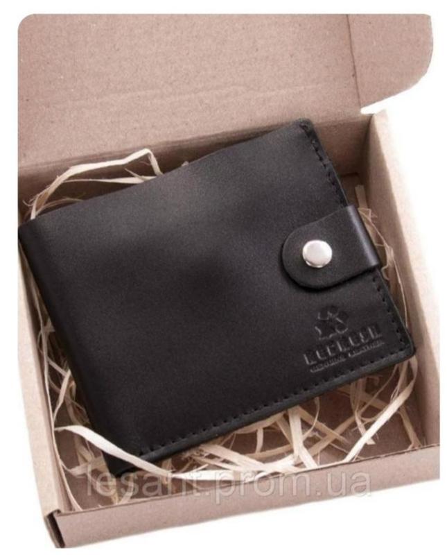 Гаманець виготовлений з якісної натуральної шкіри у чорному кольорі. Характеристики: 1 відділення для купюр; 2 осередки для карток; відділення для монет знаходиться всередині та закривається на кнопку. Розміри: ширина – 10.5 см; висота – 9 см; Виготовлено в Україні Можна замовити коробочку крафтову - 25 грн.