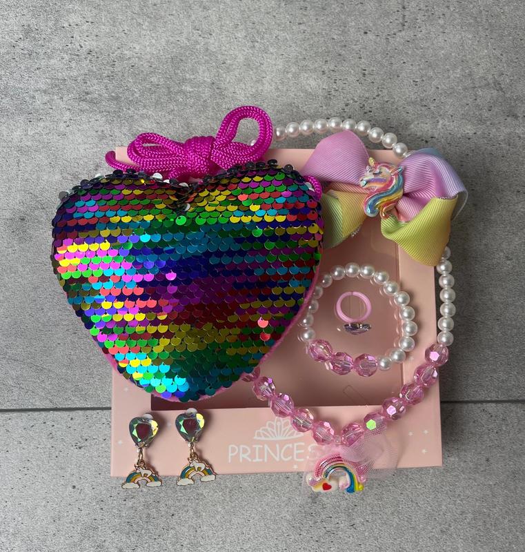 Набір для маленьких модниць В подарунковій упаковці 🤩 Ідеальний подарунок дівчинці на 14 лютого або на 8 березня або день народження 😍😍😍 В набір входить - гаманець в пайєтках -перевертишах,заколка ,браслет ,намисто з кулоном ,сережки- кліпси і колечко