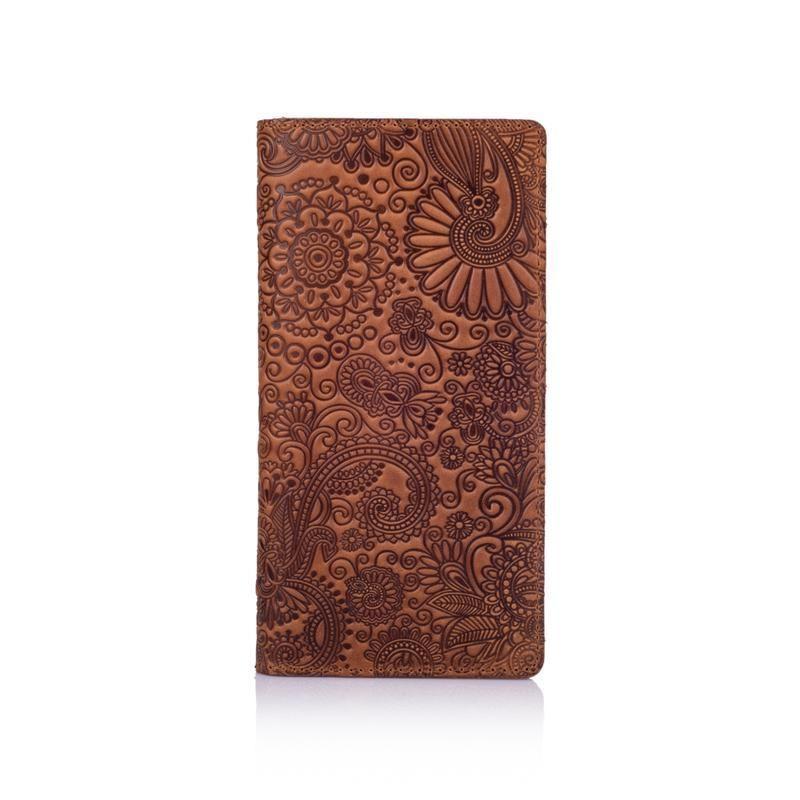 WP-05-S17-1340-T005 Кількість відділень для купюр - 2 Кількість відділень для кредитних карт - 3 Кількість відділень для монет - 1 Довжина - 190.0(мм) Ширина - 95.0(мм) Додаткові характеристики: Вигляд шкіри за способом обробки - Матова (Вінтажна Crazy) Оздоблення - Тиснення авторського малюнка на шкірі|Тиснення Колекція - Mehendi Art Додаткові характеристики: Стать: Унісекс Колір: Коричневий Матеріал: Шкіра Тип застібки: На кнопках