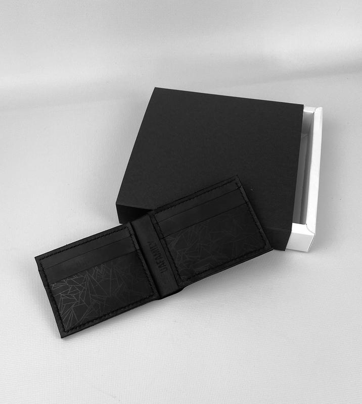 Черный кошелек из кожи Crazy Horse. Имеет 6 отделов под карты. На лицевой стороне геометрический рисунок. Мягкий и приятный в использовании