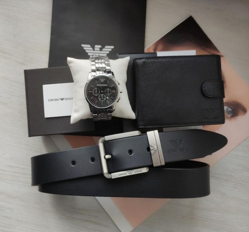 Мужской подарочный набор armani кожаный ремень и кошелек и часы silver/black 52982