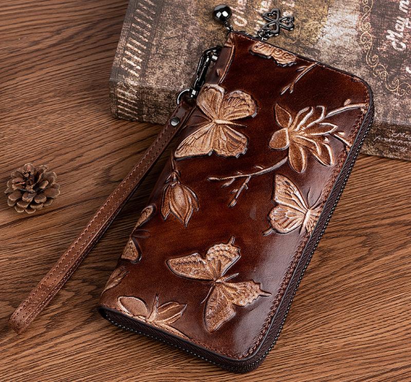 Жіночий шкіряний гаманець із метеликами з натуральної шкіри, портмоне жіноче з тисненням м...