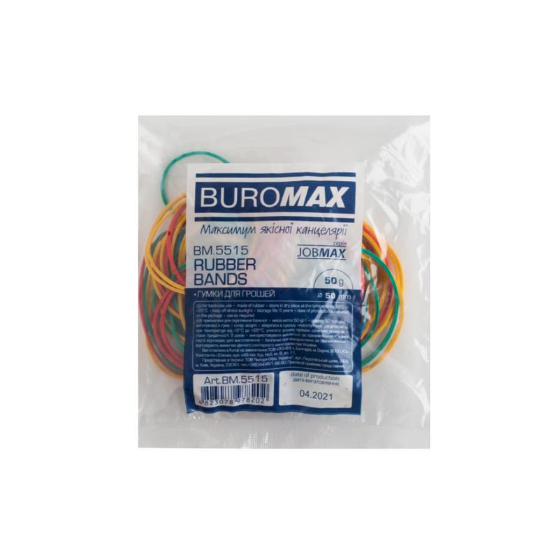 Гумки універсальні BUROMAX — пряме призначення гумок — перетягування грошових купюр, але, крім того, ця продукція використовується для з'єднання паковань медикаментів, в аптеках і на виробництві, фасування канцелярського приладдя, дрібної торгівлі, під час виготовлення побутових приладів, а також у домашніх умовах для скріплення. Вага: 50г.