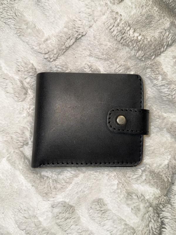 Абсолютно новий чорний шкіряний гаманець. Чоловічий, може бути унісекс. Застібається на кнопку. Розміри у закритому стані 11х9 Товщина у закритому стані 1 см. Якісна дорога шкіра. Упакований у крафтову коробку з натуральним наповнювачем (деревна стружка).