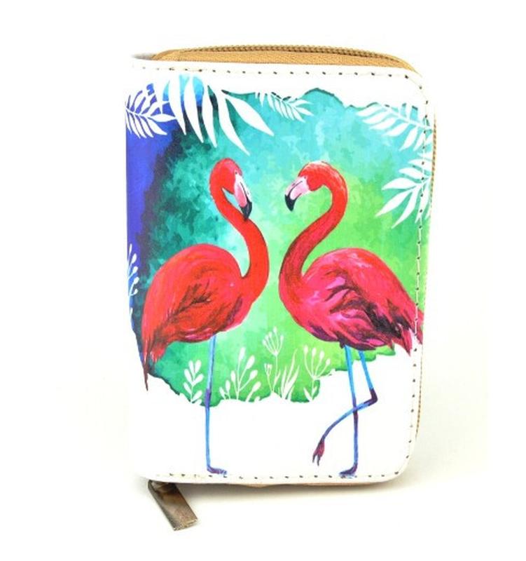 Кошелек с принтом фламинго из эко-кожи, закрывается на молнию, имеет два отдела для купюр, есть отдел для мелочи на молнии, есть четыре отдела для кредитных карт/визиток.