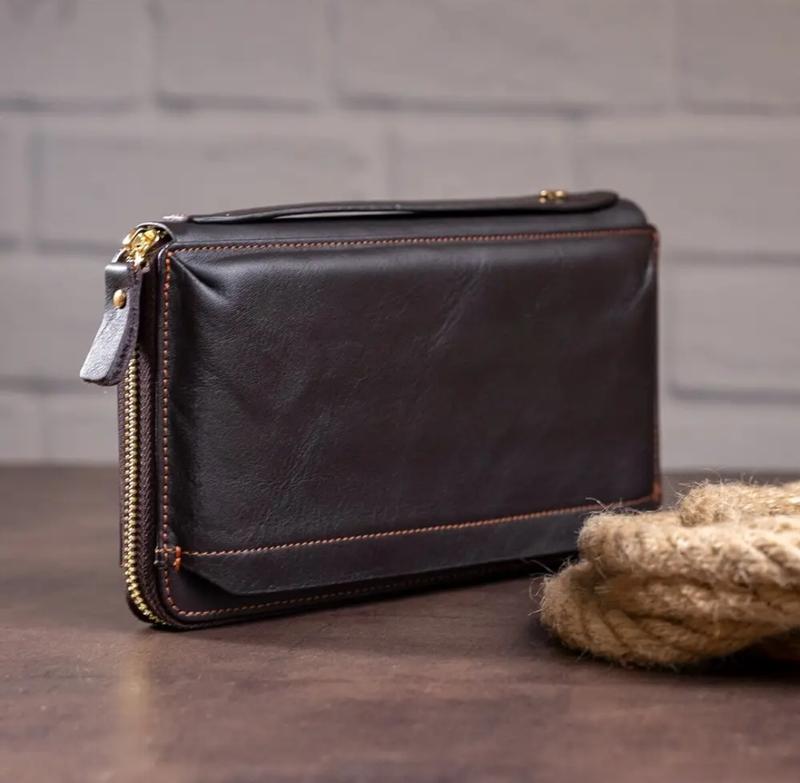 Матеріал: натуральна шкіра високої якості. Колір: коричневий. Розміри (ШхВхГ, см): 22,5х12х4см. Артикул: 14655 Бренд: Vintage. Опис: - основне відділення на змійці; - накладної відкритий кишеня-гумка; - 2 відсіки для купюр з перегородкою монетницьою на змійці; - 8 слотів для кредиток; - 1 відкрита кишеня; - на лицьовій стороні відкрита кишеня з клапаном на двох магнітах; - на тильній стороні кишеня на змійці; - ремінець для носіння на руці. Суперстильна барсетка для чоловіків. У барсетку ви можете покласти все найнеобхідніше і все буде під рукою. Внизу аксесуара є ремінець для носіння на руці, що дуже зручно у використанні. Шкіра м'яка на дотик. Фурнітура в клатчі золотистого кольору. По краях аксесуар прошитий коричневою ниткою. У барсетку можна помістити свій телефон, щоб не заважав в руках.