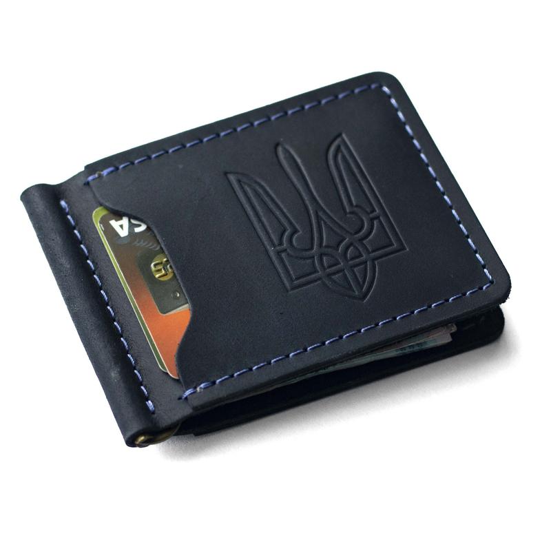 Затискач для грошей та карток tryzub blue з натуральної шкіри темно-синій шкіряний тримач...