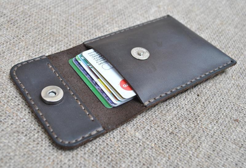 Місткий кардхолдер з натуральної шкіри ручної роботи. Виконаний з натуральної шкіри crazy horse товщиною 1,4 мм прошитий міцною 1 мм ниткою. Чохол дуже місткий, як мінімум 10 карт в ньому розміщуються вільно, також по висоті поміщаються і візитки, має магнітну кнопку для закривання. Колір шкіри можна вибрати з асортименту, також як і колір нитки. Розмір кардхолдера 10 см*8 см Додаткові характеристики: Стать: Унісекс Матеріал: Шкіра Кількість відділень для кредитних карт: 1 відділення Персоналізація: З тисненням Тип застібки: Магнітна