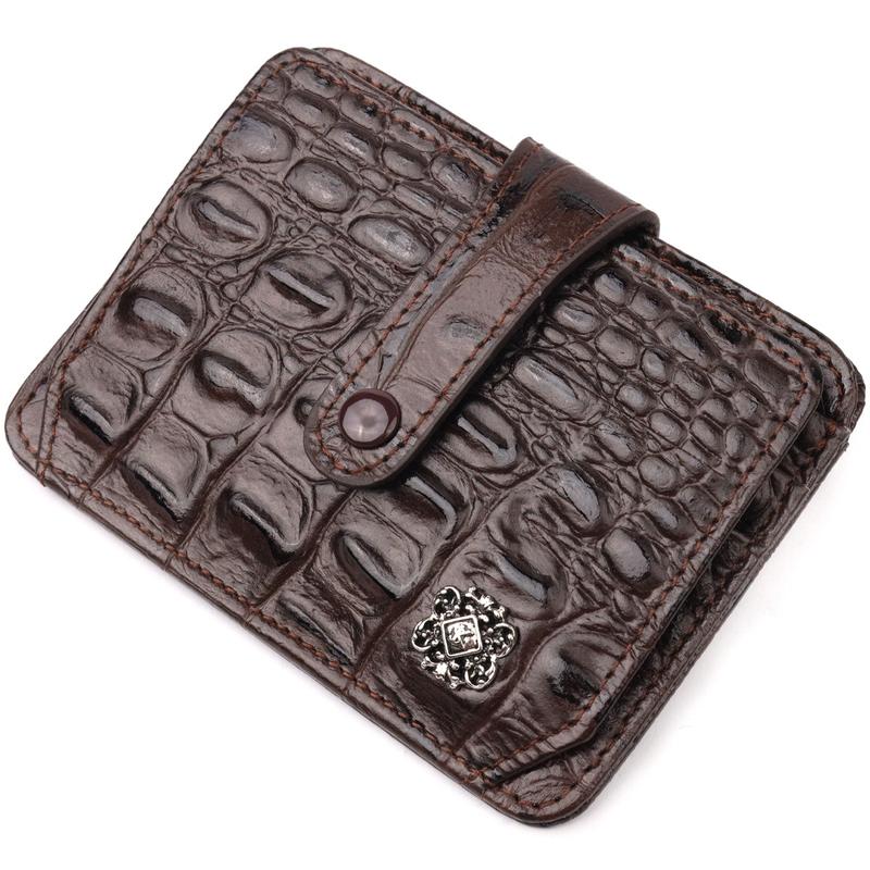 Колір: коричневий; Матеріал: натуральна шкіра високої якості; Розмір (ШхВхГ, см): 11х8х0,5 см; Країна-виробник: Туреччина Опис: - три слоти для кредитних карток усередині гаманця та два слоти зовні; - одна прихована кишеня; - дві комірки, всередині та зовні, під сіточкою для фото або документів; - закривається хлястиком на кнопку; — виріб упакований у фірмову коробку. Цікавий картхолдер із натуральної шкіри з тисненням під крокодила, у коричневому кольорі. Під час закриття розворот фіксується на хлястик із кнопкою. На лицьовій стороні у вигляді декору розташований металевий логотип виробника. Аксесуар упакований у фірмову коробочку. Вироби з натуральної шкіри завжди будуть чудовим подарунком для близької людини.