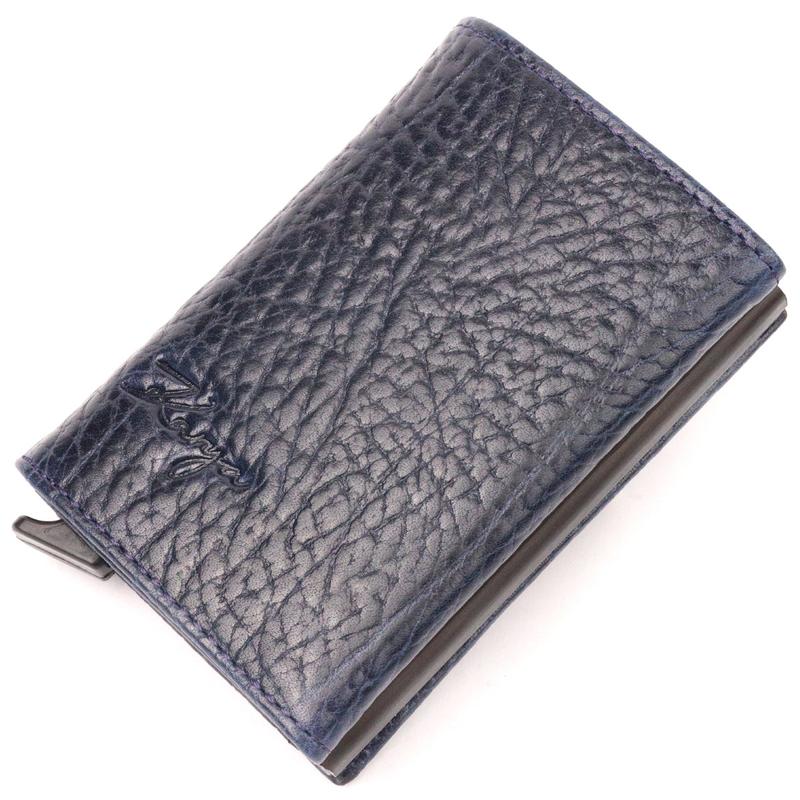 Колір: синій; Матеріал: натуральна шкіра високої якості; Розмір (ШхВхГ, см): 7х9, 5х2, 5 см; Країна виробник: Туреччина. Опис: - одне відділення для паперових грошей; - металеве відділення для семи пластикових карток із самовідкидним механізмом; - зовні осередок під сіточкою для фото чи документів; - виріб упакований у фірмову коробку. Практичний картхолдер з натуральної шкіри, призначений для зберігання банківських та дисконтних карток та невеликої кількості готівки. Має лаконічний дизайн, відмінно лягає в руку, поміщається в кишеню, а також будь- яку сумку. Шкіра м'яка, приємна на дотик. Механізм працює надійно та зручний у використанні; картки добре закріплені в аксесуарі. Відмінна ідея для подарунка близькій людині.