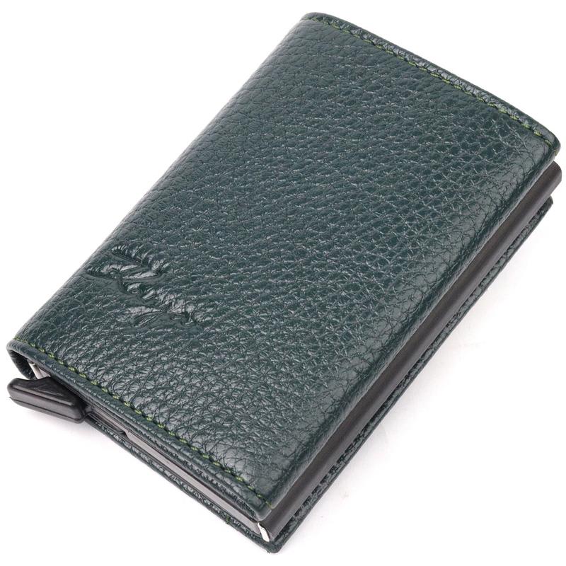 Колір: зелений; Матеріал: натуральна шкіра високої якості; Розмір (ШхВхГ, см): 7х9,5х2,5 см; Країна виробник: Туреччина. Опис: - одне відділення для паперових грошей; - металеве відділення для семи пластикових карток із самовідкидним механізмом; - зовні комірка під сіточкою для фото або документів; — виріб упакований у фірмову коробку. Зручний картхолдер із натуральної шкіри, призначений для зберігання банківських і дисконтних карток і невеликої кількості готівок. Має лаконічний дизайн, чудово лягає в руку, поміщається в кишеню, а також у будь-яку сумку. Шкіра м'яка, приємна на дотик. Механізм працює надійно та зручний у використанні; картки добре закріплені в аксесуарі. Чудова ідея для подарунка близькій людині.