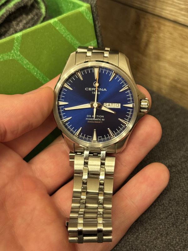Новые часы, подарили не ношу, чек документы все имеется. Часы Certina DS Action Day-Date C032.430.11.041.00 ПОЛ Мужские БРЕНД Certina КОЛЛЕКЦИЯ DS ACTION СТИЛЬ Классика СТЕКЛО Сапфировое ФОРМАТ ВРЕМЕНИ 12 Часовой Механизм ТИП МЕХАНИЗМА Механика С Автоподзаводом ФАБРИКА СБОРКИ Швейцария Корпус ДИАМЕТР КОРПУСА 41 МАТЕРИАЛ КОРПУСА Нержавеющая Сталь ЦВЕТ КОРПУСА Серебристый ФОРМА КОРПУСА Круглые ВОДОЗАЩИТА 200 WR ТОЛЩИНА 11.96 Браслет БРАСЛЕТ / РЕМЕШОК Браслет МАТЕРИАЛ БРАСЛЕТА / РЕМЕШКА Нержавеющая Сталь Циферблат ЦВЕТ ЦИФЕРБЛАТА Синий ВИД ИНДИКАЦИИ Индексы ТИП ИНДИКАЦИИ Аналоговый icon Дополнительные характеристики Индикация даты Индикация дня недели Антибликовое Описание Часы Certina DS Action Day-Date C032.430.11.041.00 Эти часы CERTINA C032.430.11.041.00 - это идеальное сочетание классического стиля и высокого качества. Они имеют серебристый корпус из нержавеющей стали с диаметром 41 мм, а также механический механизм с автоподзаводом и браслет из нержавеющей стали. Часы обладают водозащитой 200 WR, а их синий циферблат имеет индексы и индикацию даты и дня недели. CERTINA