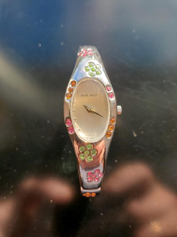 Красивий вінтажний жіночій кварцовий годинник-браслет із стразами, привезено з Америки, бренд Nine West, модель 9w/1514 763/H2, легкі сліди від носіння у вигляді потертостей покриття по боках, країна виробник Таїланд, механізм на комплектуючих бренда Ronda Швейцарія, зборка Таїланд, якісний та надійний, скло чисте, всі стрази присутні, внутрішній діаметр приблизно 6см це на зап'ястя до 17.5см, розмір можна зменшити за рахунок подовжувач та секцій браслета тоді на зап'ястя від 15см, ширина з головкою 20мм, годинник попри те що його носили без бруду і виглядає на зап'ясті дуже красиво- гарна ідея на кожен день.