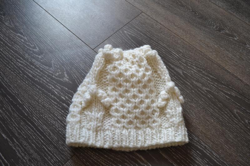 Гарна шапка, колір пряженого молока. Ширина- 24см, висота 21см. Склад: 50 вовна, 50 акрил.