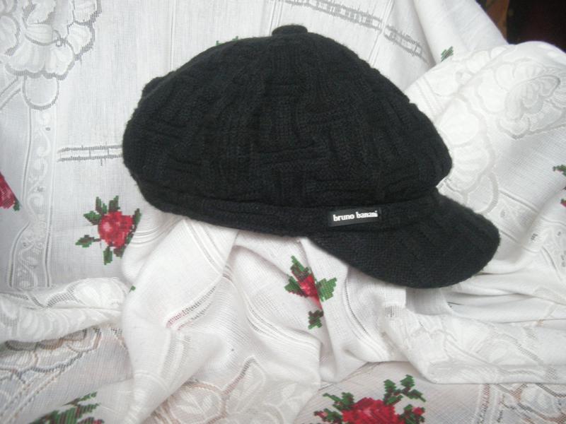 Класна кепка соковитого чорного кольору,фірмова,красива в'язка букле,по центру ґудзик,обтягнута тканиною,козирок,з правого боку лейбочка,всередині натуральна підкладка чорного кольору,тепла,як для осені,так і для зими.