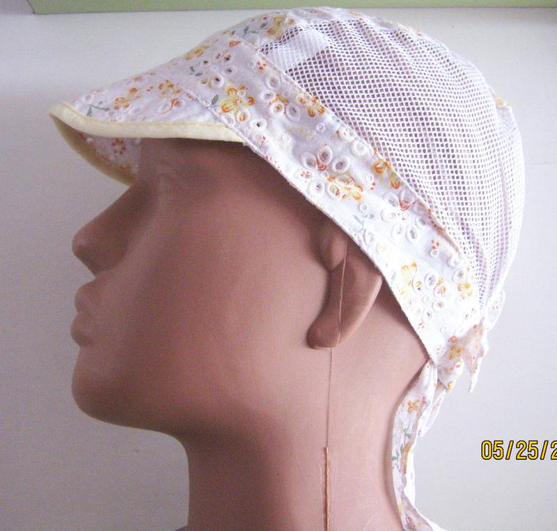 Бандана для девочки С небольшим козырьком, по бокам сеточка. Выполнена из тонкой хлопковой ткани с шитьем Цвет: с желтым, с розовым, с голубым Состав: хлопок Размер: 50-54 см.