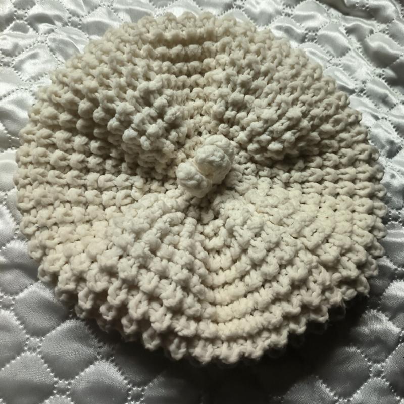 Чудовий в'язаний жіночий берет млечного кольору, р. 54. Стан - новий. Виробництво - Україна, Хендмейд. Склад 100% акріл. Висота бортику 6 см ( на другому фото). Повна висота берета 16 см, окружність голови 54 см .Тягнеться до 59 см
