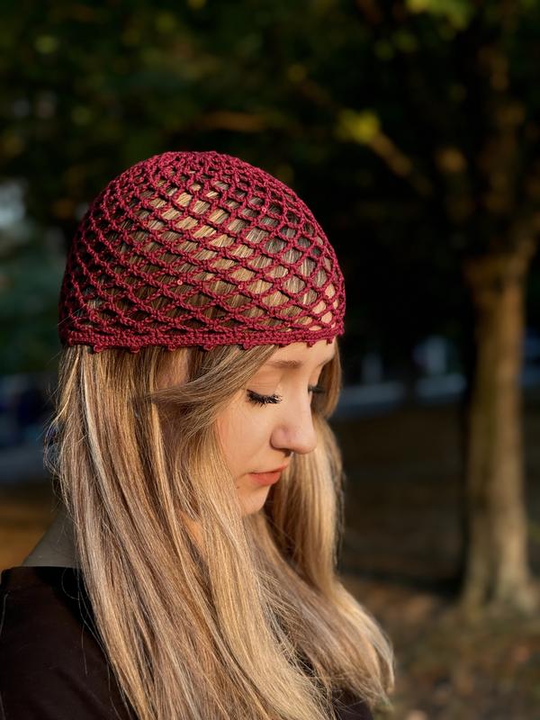Трендова жіноча шапочка кроше з мікро-паєтками - абсолютний хіт літа. Шапка сітка-павутинка звʼязана вручну з преміальної мʼякої натуральної бавовни з дрібними паєтками. Пряжа виробництва Італія, преміум якість. Шапочка чепчик ніжна і комфортна до тіла. Стильне доповнення вашого образу. На фото Розмір 54-55 ОГ моделі 55см Довжина/висота шапочки ~16.5-17см Колір бордо з червоними паєтками Великий вибір кольорів/розмірів на замовлення, за запитом.