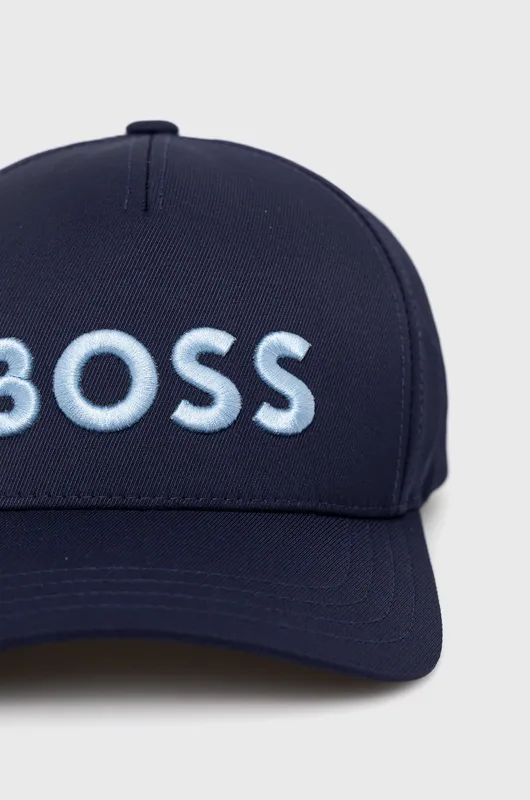 HUGO BOSS Оригінальна кепка бейсболка з колекції BOSS Black Виготовлена з еластичного твілу темно синього кольору. З об'ємним вишитим логотипом в контрастному кольорі. Ремінець для регулювання об'єму виконаний у нову фірмову полосу бренду BOSS. Металева фурнітура. Бавовняна підкладка. Матеріал верху: 96% поліестер, 4% еластан Підкладка: 100% бавовна. Відправка після повної оплати на картку!