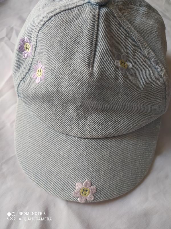 блакитна джинсова бейсболка з аплікацією у вигляді вишитих різнокольорових квіточок зі смакомами всередині, має білу бавовняну підкладку