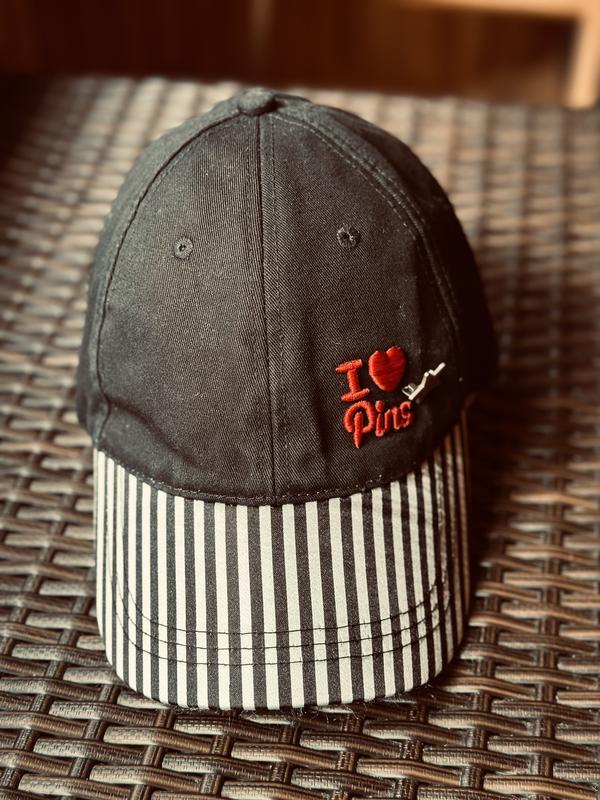 Стильна бейсболка “i ❤️ pins”, унісекс, чорна, смугастий козирок