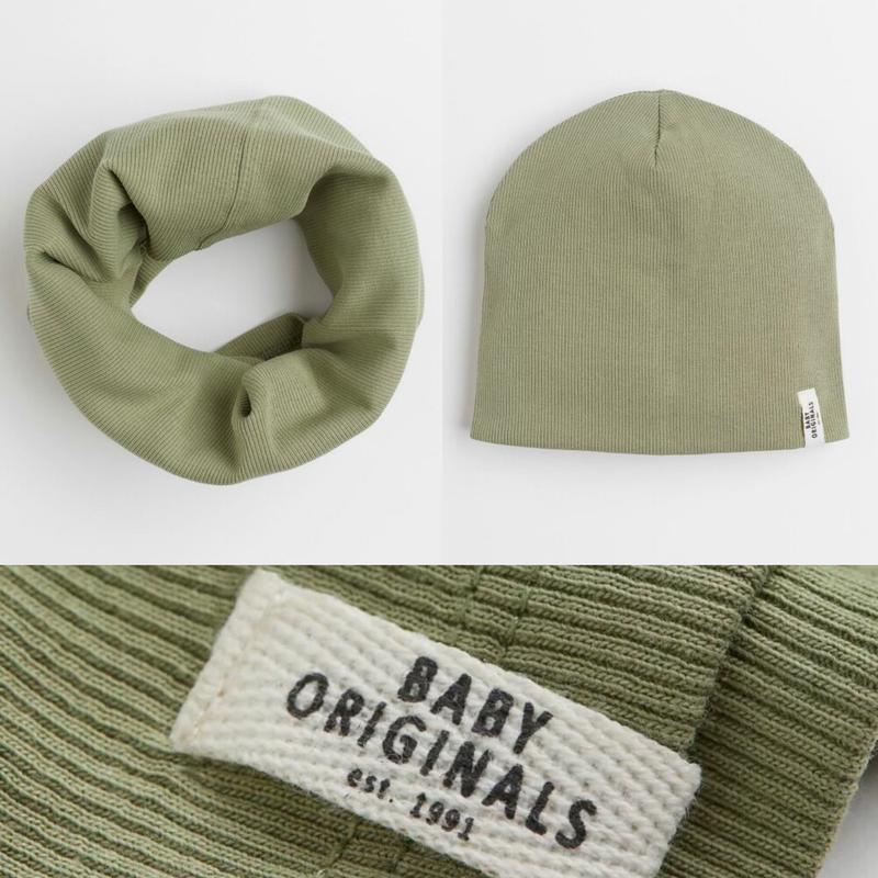 Дорогі покупці! Перш ніж натиснути кнопку ЗАМОВЛЕННЯ, уточніть наявність розміру через кнопку ЗАДАТИ ПИТАННЯ, Приємних покупок! Трикотажний комплект - в рубчик кольору хакі від H&M шапка і снуд РІСТ 74-80 ( висота 17 ширина 21 см снуд 34*24 см) см 86-92 ( висота 19 ширина 22 см снуд 34*24 см) СКЛАД бавовна 95%; Еластан 5%