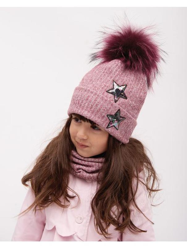 Стильний комплект для дівчинки Шая (шапка+хомут) Розмір: 46 (1-1,5 роки) Склад: верх-акрил 100%, НИЗ: бавовна 95%, еластан 5%. У набір входить тепла об'ємна шапочка з відворотом. На маківці великий хутряний помпон. Як декор використані яскраві нашивки. Хомут виконаний із трикотажу в тон та дозволяє захистити шию малюка.