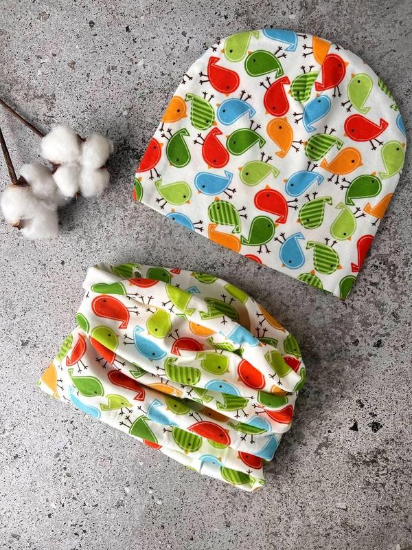 Дитячий весняний трикотажний набір , шапка та хомут до 2-ох років, "пташечки" . ( заміри...