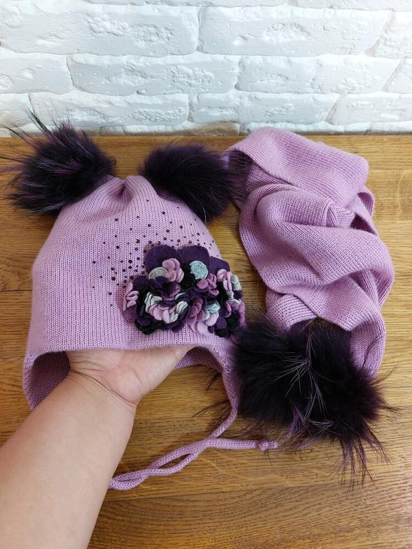 Дуже красивий комплект шапка та шарф шерсть із натуральними помпонами 4-8 років