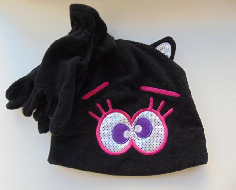 новий, без бірки. Зроблено у Китаї Розмір: osfm (One Size Fits Most, безрозмір) 100% поліестр фліс Шапка подвійна, верх щільний фліс, усередині тонше. ПО низу 25 см, тягнеться до 29 см, глибина 21 см. Рукавички один шар. довжина 21 см Приблизно на 6-10 років ОГ манекена 53 см