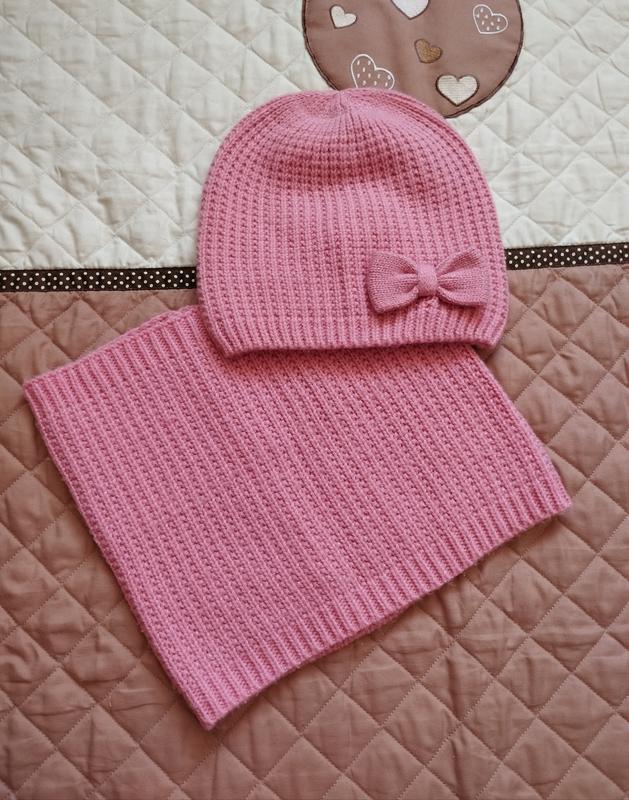 стильний набір для дівчинки на весну шапка та снуд стан ідеальний розмір на 4-8 р прикрашений бантиком та блискучою ниткою