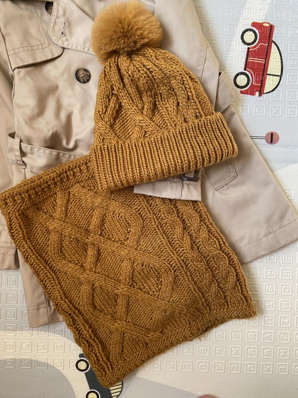 Дуже красивий комплект для дівчинки, гарна вʼязка. Шапочка на котоновій підкладці. По бірці на обʼєм 54 см. Я на мене маломірить. Ми носили в 6 років. Можна швидше на 4-6.По бірці 6-9