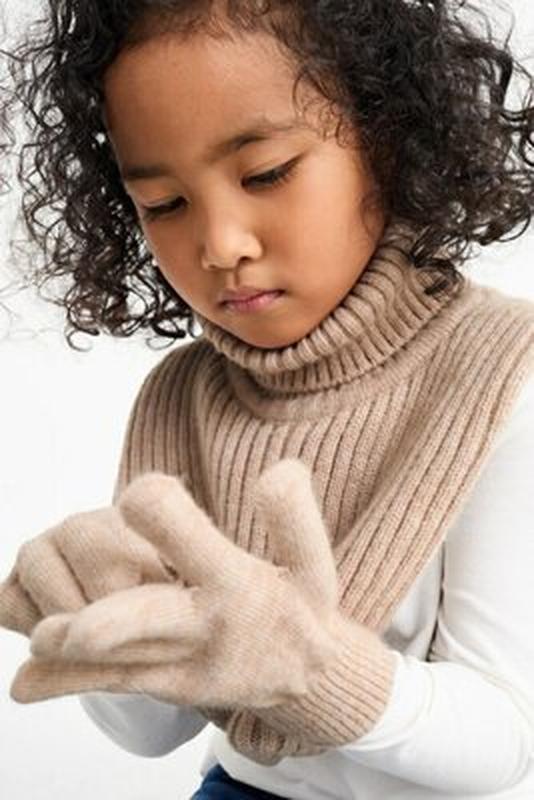 Комплект из мягкой трикотажной ткани. Топ с имитацией горловины в ребристой вязке и флисовая подкладка. Перчатки с эластичным рукавом, однослойные. 41% акрил,31% полиэстер, 20% полиамид. Размер 104-122 на возраст 4-7 лет. длина от плеча-22см. ширина-24см. длина перчаток-15,5см.